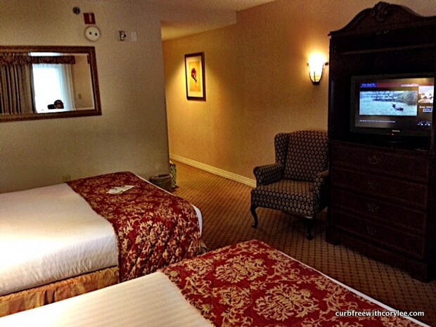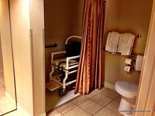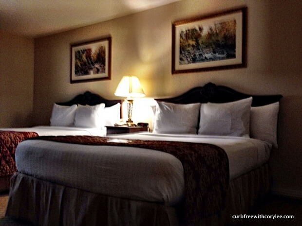 After a quick and easy check-in, we strolled over to room number 114, which was only a few steps away from the lobby. Our room was exactly as promised with two queen beds and a roll-in shower. Having two queen beds in an accessible room is rare because it usually doesn’t leave enough space for the wheelchair to maneuver around easily. However, this room was quite large and there was plenty of space to roll around for me so having two queen beds didn’t pose a problem at all. We also had a refrigerator, microwave, flat screen television, and a nice little patio area that was easily accessible. Since we were on the bottom floor our view was only of the parking lot, but it was still nice to sit outside and feel the breeze.