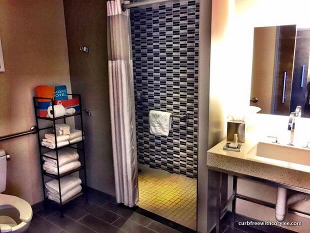 I stayed in room 333 and it was spacious enough to easily roll around in. Other accessible features included the roll in shower, the pull under bathroom sink, and I was able to smoothly roll out onto the balcony without getting whiplash. 🙂