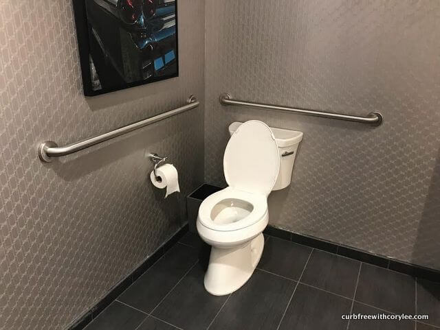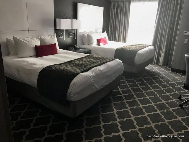 Before I enter any hotel room, I get a nervous feeling in the pit of my stomach. Will the room actually be accessible for me? Will there really be a roll-in shower? I entered room 306 and quickly realized that it was exactly what I needed. There were two beds, a roll-under desk, flatscreen TV, a full length mirror, and an Elvis inspired picture on the wall. The bed would be a bit high if you’re a wheelchair user that needs to transfer yourself, but it was lower than many beds that I’ve seen in the past. Also, if you use a hoyer lift, it would not be able to roll under the beds. There was no clearance underneath them, but I’m sure if you talk to the hotel’s management they could come up with a solution. They were always friendly and willing to help.