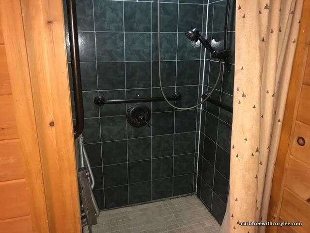In addition to the bunk beds and bathroom with the tub on the lower level, there’s also another accessible bedroom. Just like the bed on the main level, a hoyer lift could easily roll under the bed and a wheelchair user could transfer themselves if able. Connected to this accessible bedroom was a bathroom with a pull-under sink and roll-in shower.
