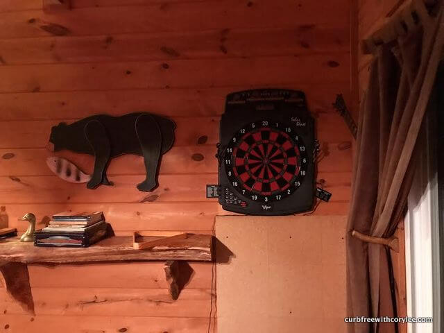 If you go up the stairs from the living room, you can get to the upper level. On this level there was a pool table, dart board, and a restroom. It’s more of a recreational area and doesn’t have a bedroom. Unfortunately, this level is not wheelchair accessible. While I would like for it to be accessible of course, I didn’t necessarily mind that it wasn’t because I could get to all of the other areas in the cabin and there was plenty for me to do. I got my mom to take some photos of the upper level so that I could see it, and here they are below.