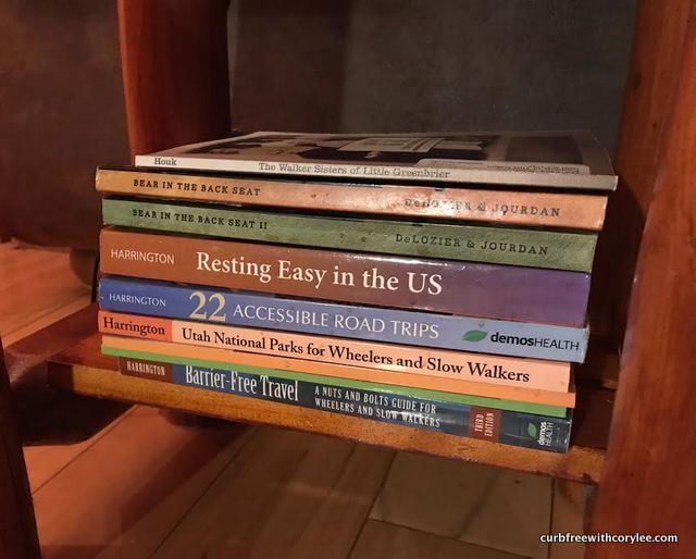 I also loved all of the wonderful amenities and special touches that were scattered throughout the cabin. Everything seemed to be made of wood, which gave it a true cabin feel, and there were even beautiful carvings of bears, raccoons, owls, and more animals on display. There were also plenty of board games to choose from (we enjoyed playing Taboo one night) and books, including several books about accessible travel written by my friend Candy Harrington.