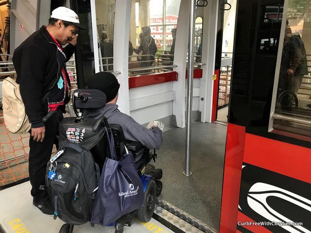 After tossing back a Duck Fart or three, I made my way to the Mount Roberts Tramway, which was directly across from my cruise ship. It has been operating since 1996 and is the only aerial tramway in southeast Alaska. It’s also one of the most vertical tramways in the entire world, but I was thrilled to discover that it’s fully wheelchair accessible. In fact, it received the Governor’s Award for facility accessibility design because it’s so compliant. I’ve ridden cable cars and tramways in several destinations, everywhere from Gatlinburg, Tennessee to Baños, Ecuador, and this was probably my favorite one yet.