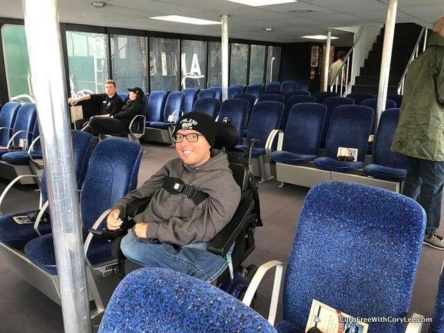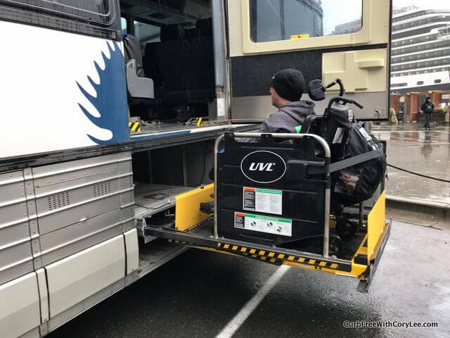 A wheelchair accessible bus picked us up where our cruise ship was docked and drove us about 30 minutes to the boat. The bus had a lift and tie-downs to secure my chair.