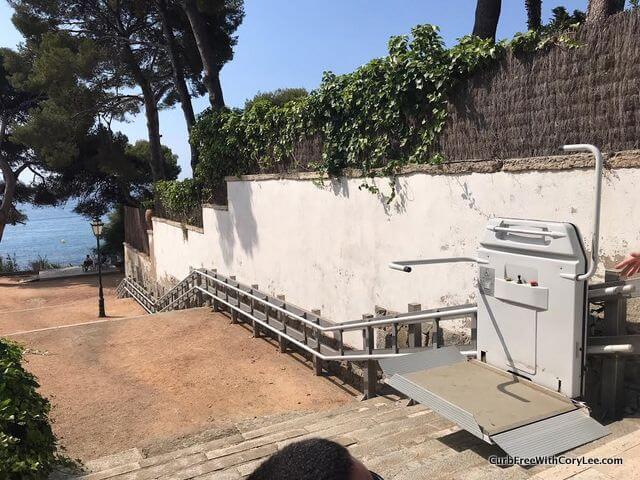 The wheelchair friendly trail starts at Plaça de la Gacela of S’Agaró. There was a long staircase to get down to the trail, but for wheelchair users, there is a lift in place. I rolled onto the lift and after about five minutes (it’s veeery slow, but at least it’s safe!), I was at the bottom and on the Camino de Ronda.