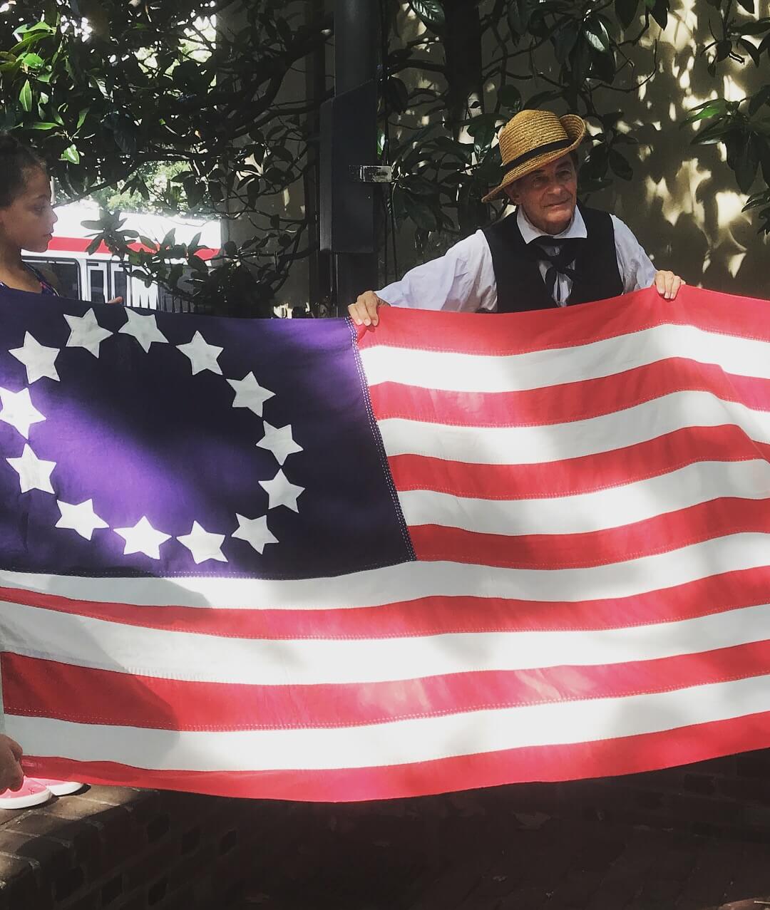 Betsy Ross is the well-known and loved woman who sewed the first American flag. Her house is a fun place to visit! The actual house, unfortunately, isn’t wheelchair accessible. I was able to get there right at the opening time of 10 AM though and I could see a flag raising ceremony in the courtyard. I also got to meet Betsy Ross herself! Or, I at least got to see someone dressed like her anyway.