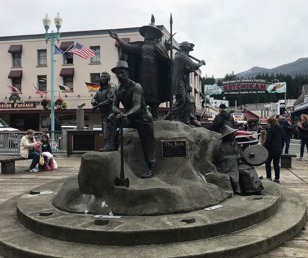 Ketchikan was quaint, but full of friendly people wandering around. I visited mid-August, which is one of the busier months for the city. After getting off the ship, one of the first things that I saw was The Rock. No, this isn’t just a boring old rock. It’s actually a really cool sculpture dedicated to Ketchikan’s heritage and it tells the story of how Ketchikan came to be. According to http://ketchikanstories.com/, “Six of the seven figures on the sculpture represent a prominent archetype in the city’s history—a fisherman, a minor, a logger, a bush pilot, a frontierswoman, a Native drummer. The seventh represents an actual historical figure—Chief Johnson, a Tlingit who stands on top of The Rock, symbolizing the fact that his people were the first to make their home in SE Alaska.” It was a beautiful sculpture to admire and afterwards, we made our way into a few souvenir shops.