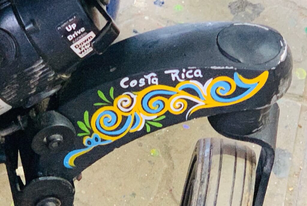 The coolest thing about the oxcarts, in my opinion, are the intricate designs on them. At Fabrica de Carretas Eloy Alfaro, we were able to see the talented artists as they painted new oxcarts. Each design is completely by hand and after seeing how talented the artists were, I half-jokingly asked one of them if he wanted to paint my wheelchair. To my surprise, he immediately said yes and within 30 seconds, he was putting a unique design on my wheelchair. I love how it turned out and think that it’s the best souvenir I could’ve gotten in Costa Rica! Here it is –