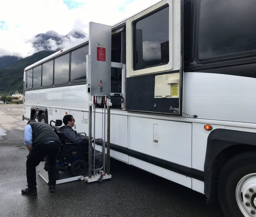 After waiting just a few minutes for the other members of our shore excursion group to get off the ship, we boarded the bus. The tour bus had a lift on it and tie-down straps inside to secure my powered wheelchair. It was a short and comfortable drive from the cruise port to Alaska 360, where our excursion began.