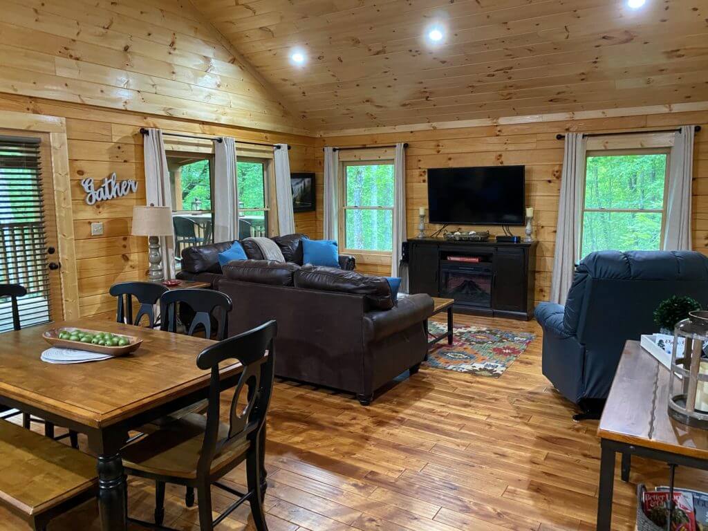 One bedroom has a bathroom with a roll-in shower and grab bars. The main level entrance has a built-in ramp, as well as an accessible back deck with a grill and hot tub. The open concept floor plan provides plenty of open space for relaxing. Cabin amenities include a hot tub, large televisions, a fully equipped kitchen, and boardgames.