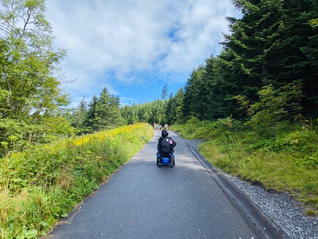The path to the top of Clingmans Dome is half a mile long, but it is fully paved. Like everyone warned beforehand, it is incredibly steep, but honestly, I thought it was pretty easy with my powered wheelchair. Everyone walking seemed to be having major trouble, but I was just rolling along peacefully.
