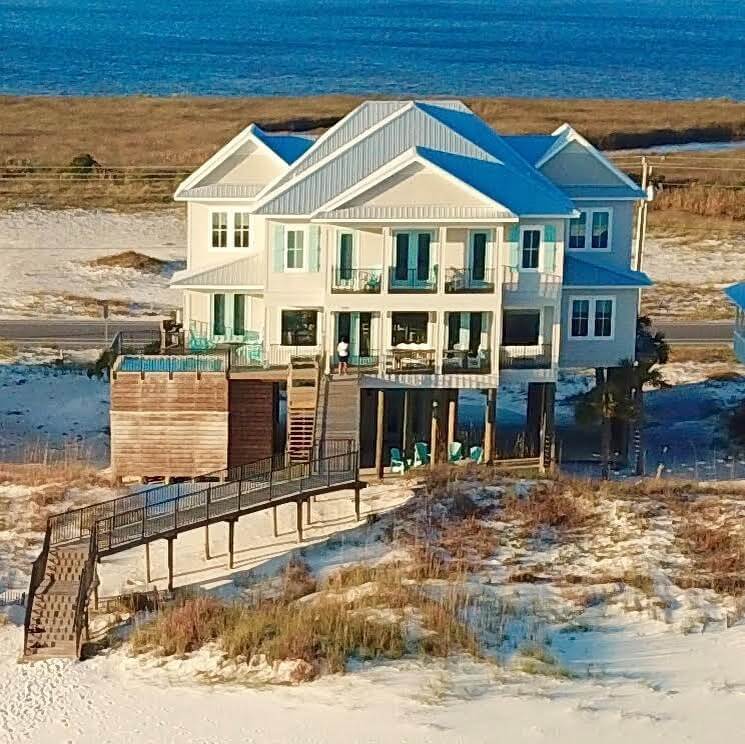 Located right on the beach, this 9 bedroom, 8 bath home can sleep 20. Being 10 yards from the beach means there are amazing views, a great atmosphere, and the sound of waves day and night. This is a great retreat rental, as there’s something for everyone with several televisions, wireless internet, a saltwater pool, hot tub, outdoor games, and a rec room with a pool table. The home also has an elevator for access on every level.