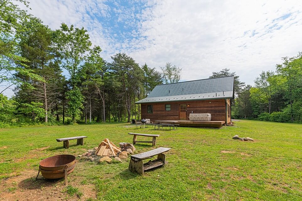 Wolf Den is the most requested cabin on the property, as the cabin is a single story and very accessible. The front covered porch is perfect for enjoying the creek that runs nearby and outdoor amenities include a fire pit and hot tub. The front porch has a no-step entry with the front door in the middle of the covered porch. The rooms are spacious and there is one wheelchair accessible bathroom, another bathroom, and an open concept main living space.