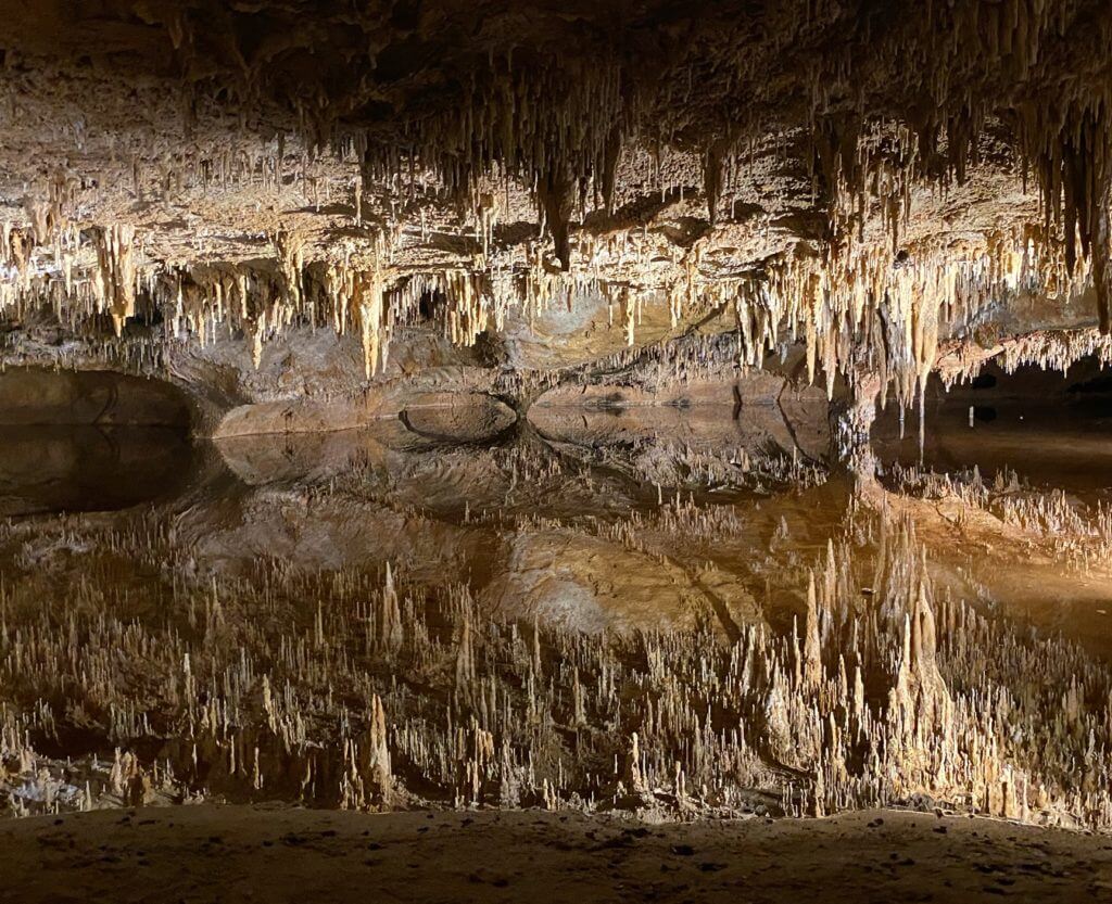 Aside from the many impressive columns, stalagmites, and stalactites, one of my favorite parts of Luray Caverns was Dream Lake. That’s right, there is a lake inside the caverns and it acts as an optical illusion. Stalactites hang over the lake, which is only 18-20 inches deep, and their reflection in the water is so crystal clear that it makes it seem like there is no water. Instead, it just looks like stalagmites and stalactites. It was a really cool optical illusion and probably my favorite part of Luray Caverns.