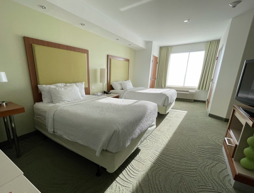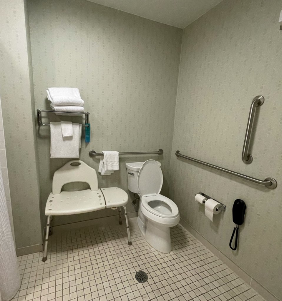 I stayed in a wheelchair accessible room with two queen beds and a roll-in shower. The room was very spacious and had a refrigerator, a microwave, a couch, and a hoyer lift/hoist could easily roll under both beds. If you do need to self-transfer though, the beds may be a bit too high.