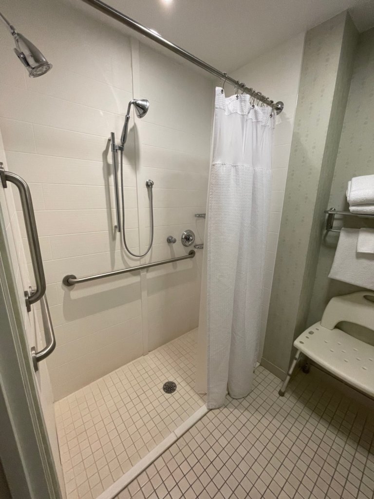 In the bathroom, there was a great roll-in shower, which had smooth entry and a handheld shower wand, and there were grab bars by the toilet. The pull-under sink was actually not in the bathroom, but in a separate area in the bedroom. It was a bit odd that there was no sink in the bathroom, but no big inconvenience. Overall, the room worked extremely well for my accessibility needs and I’d definitely stay here again.