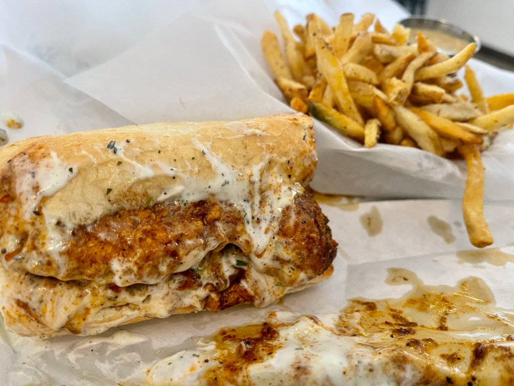 On the menu, you’ll find appetizers such as pimento cheese, fried pickles, and hush puppies. I opted to skip the appetizers and go straight to the poboys though. There are more than a dozen different kinds of poboys, so it was challenging to pick one, but I eventually decided on the “HOT HOT” poboy. It was Nashville style hot fried chicken, mayo, dill pickles, and green onion buttermilk ranch on a bun. I love spicy food and this poboy was better than anything I could’ve expected. Sooo delicious!