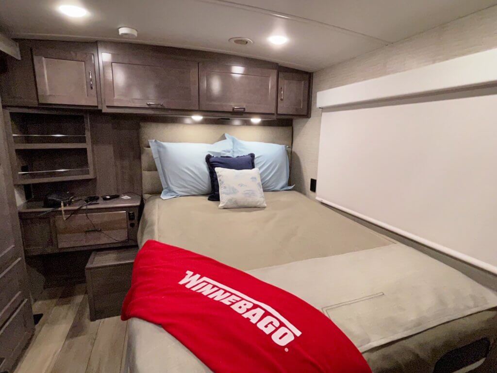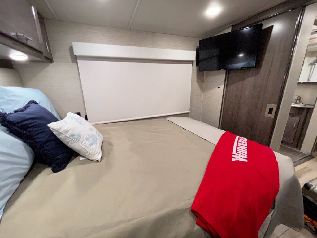 The Bedroom – A queen bed is in the bedroom at the back of the RV and the head of it can raise and lower with the push of a button. There is also a 32” TV, a nightstand, and a pretty big closet in the bedroom. My wheelchair could fit beside the queen bed, but I did not have enough space to maneuver and get into this bed. A hoyer lift also couldn’t roll under the bed and it was a bit too tall for self transferring, so I opted to sleep in the dinette bed, which was very comfortable and gave me more space to get to the bed. If I bought the Winnebago Inspire AE, I would probably swap the queen bed for a full size or even a twin bed to allow more access in the bedroom.