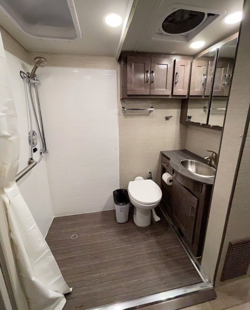 The Bathroom – The bathroom is spacious, especially for an RV, and my shower chair rolled around in the bathroom with ease. There is a sink, a toilet, and a roll-in shower with a handheld shower wand. There are no grab bars, so if that’s something you’ll need, definitely let Winnebago know upon purchasing.