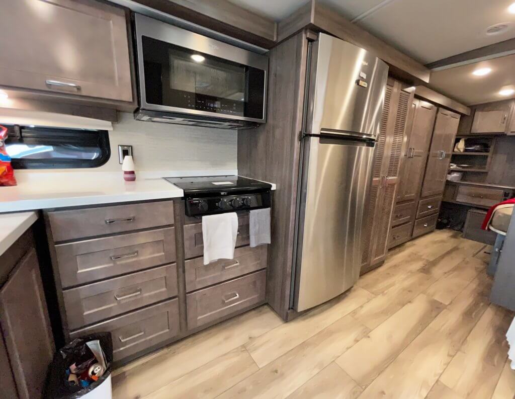 The Kitchen – In the kitchen area, there is a full refrigerator, a sink, a stove top, and a convection oven/microwave. There are also plenty of cabinets to store groceries. I loved that I could roll throughout the kitchen since it was quite spacious.