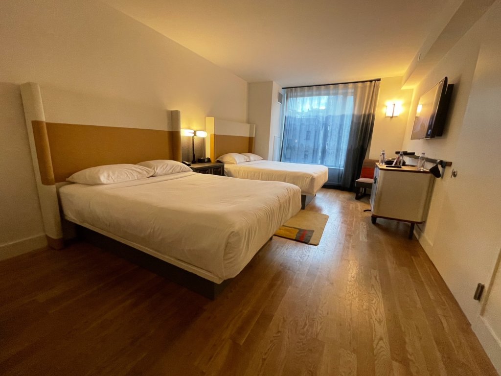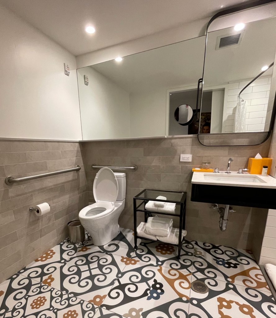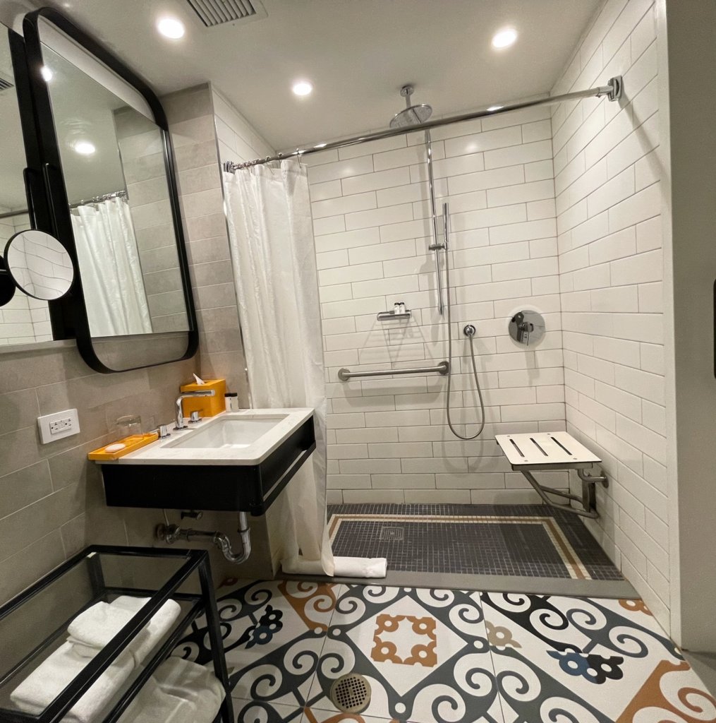 Aside from being in a nice and convenient area, Hotel Indigo Lower East Side is beautifully designed and my wheelchair accessible room worked perfectly for my needs. In the bedroom, there were two queen beds, a desk, a minibar, TV, and a full-length mirror. The beds were a great height for self-transferring, but unfortunately, a hoyer lift could not roll under them, as there was no clearance underneath.