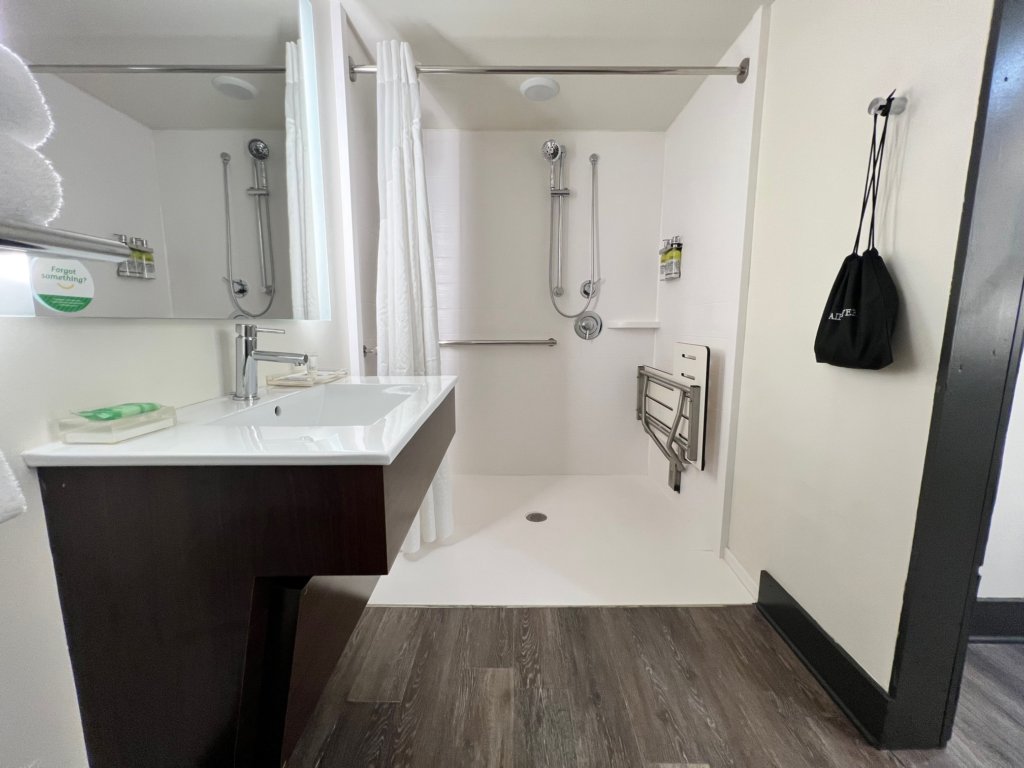 In my bathroom, there were grab bars by the toilet, a pull-under sink, and a roll-in shower. The roll-in shower had a fold-down shower seat and a handheld shower wand, making it perfect for my accessibility needs.