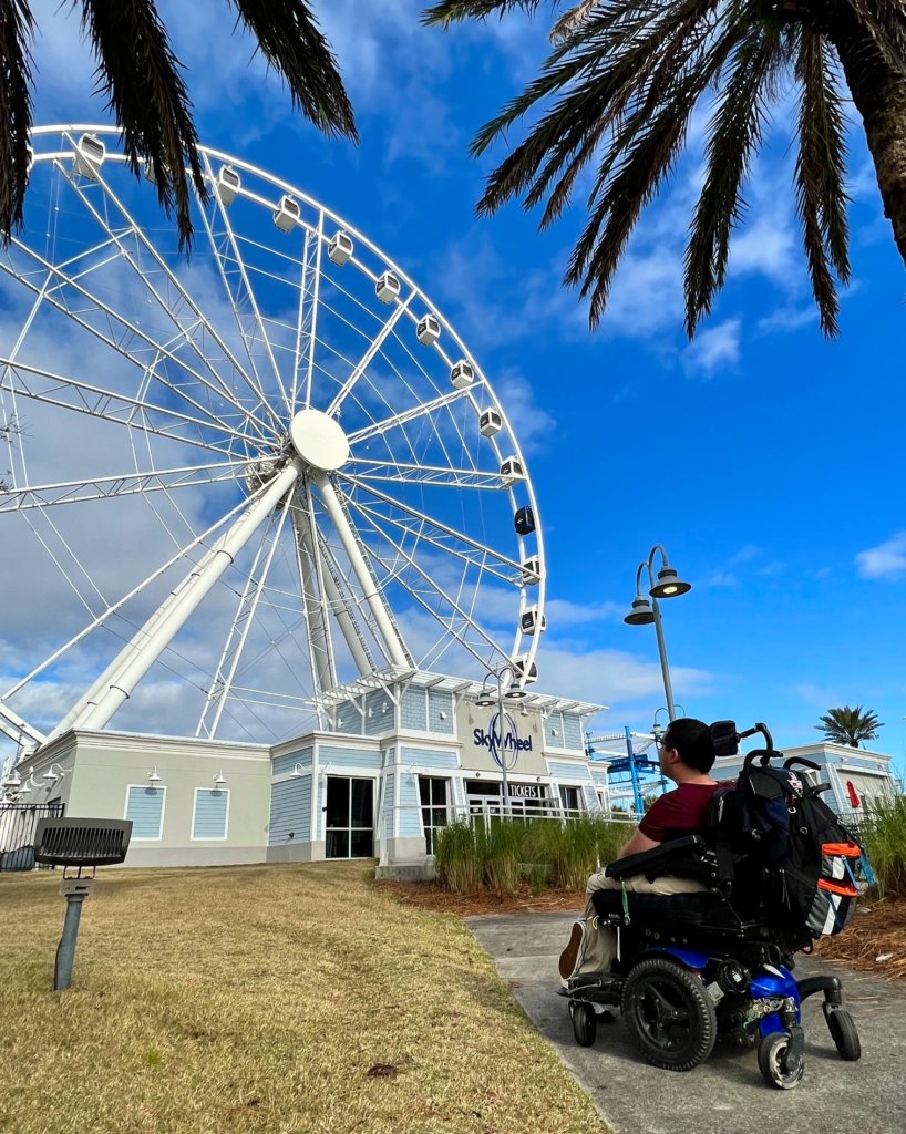After getting tickets at the SkyWheel’s admission center, I was shown where to go to roll onto the SkyWheel. Just a few minutes went by before I was able to roll into a pod and begin climbing high over Pier Park. It was very smooth and easy for me to enter the enclosed pod in my powered wheelchair, and there was plenty of space for one companion.