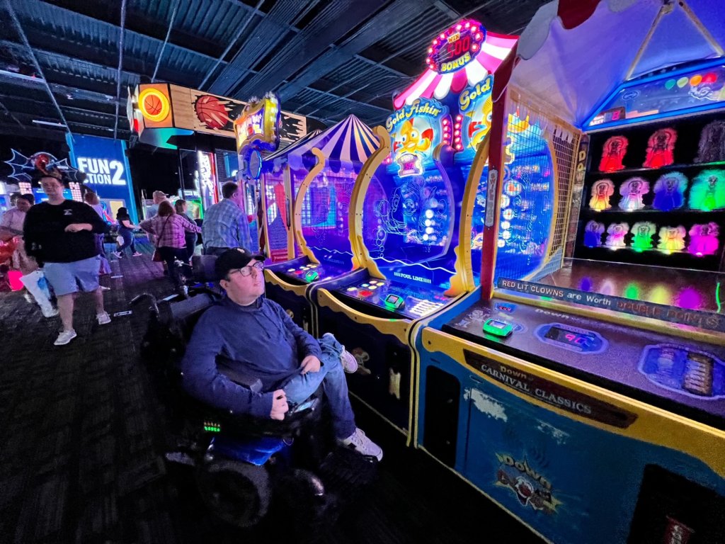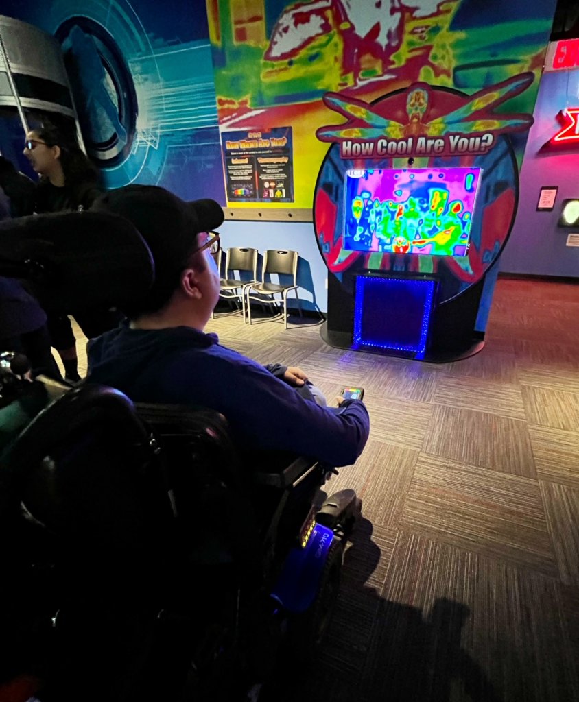 Once inside, there are over 100 hands-on exhibits that challenge the mind and expand your imagination. One of the first things I had to try was the Hurricane Shack. I rolled into the accessible entrance and as the sounds of thunderstorms began, I was then right in the middle of a category one hurricane experiencing 74 miles-per-hour winds! What a feeling! Next, I rolled to the Physical Challenge Zone and my mom placed a huge bubble wand in some soapy water and stretched a bubble right over my head. That had to be the biggest bubble I’ve ever seen. I also really enjoyed the shadow wall. I parked my chair directly in front of a camera and against a wall. Then the countdown began and the camera flashed. After the flash, I rolled away from the wall and looked back and there was my shadow still on the wall! My shadow had frozen there for all to see, even though I had already driven away. It was amazing.