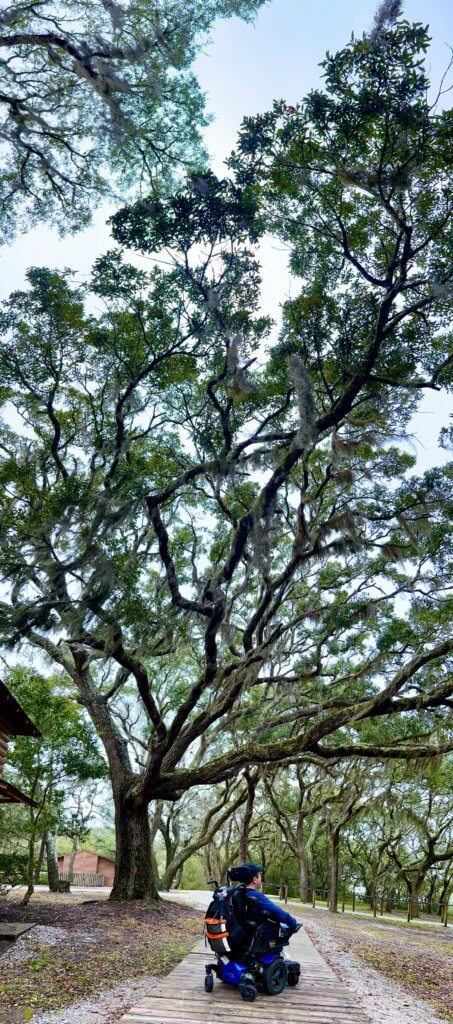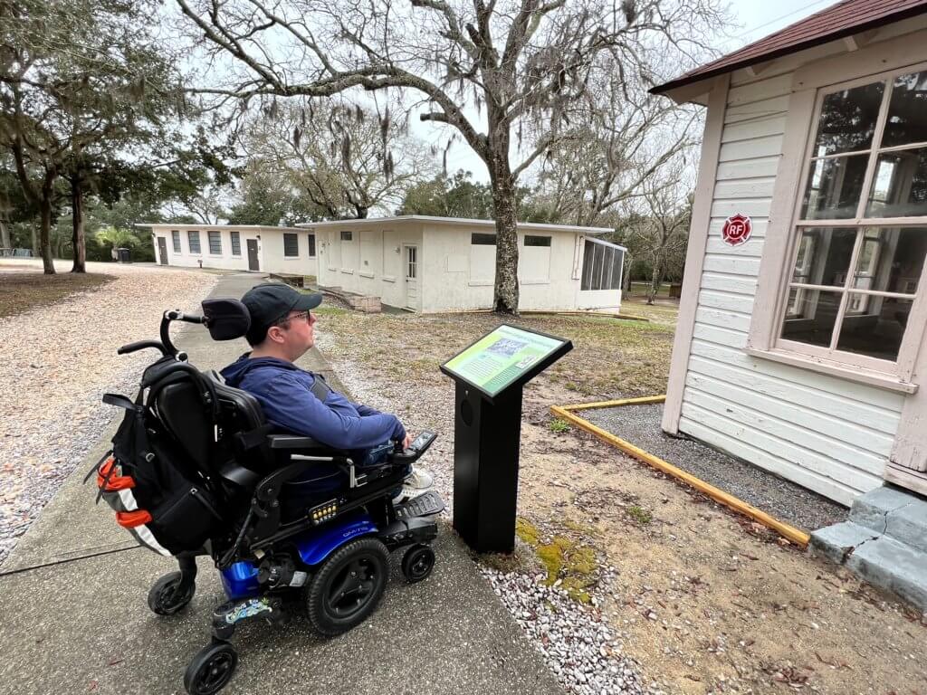Aside from wandering around the historic district, many families come to Camp Helen to go to the beach. I attempted to roll to the beach in my powered wheelchair, but I quickly got stuck in some mud, as the trail to the beach isn’t paved. However, you can use a manual beach wheelchair to get to the beach if you’d like. To get the beach wheelchair, just pop into the Camp Helen Visitor’s Center and let them know.
