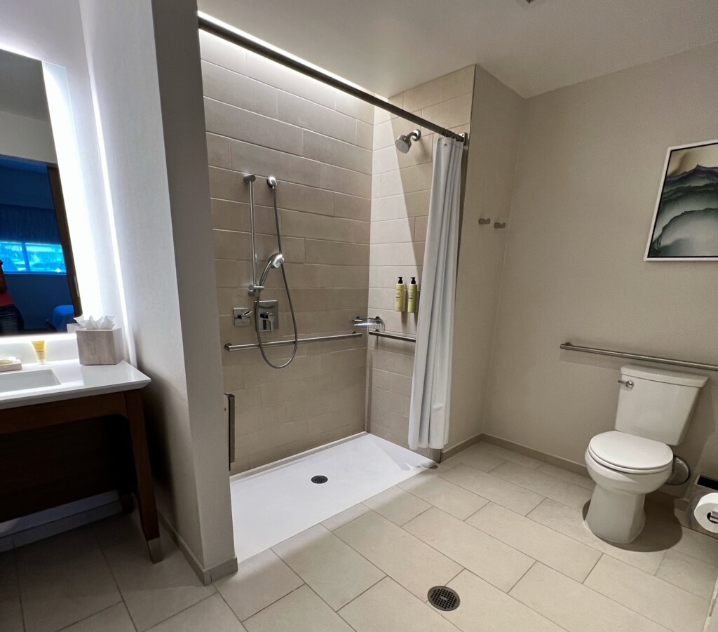 The bathroom had all of the amenities that I needed. There was a pull-under sink, grab bars, and a nice roll-in shower. There was no lip to get into the shower, which was great. It was perfectly smooth and I really couldn’t have asked for better accessibility for my needs in the room.