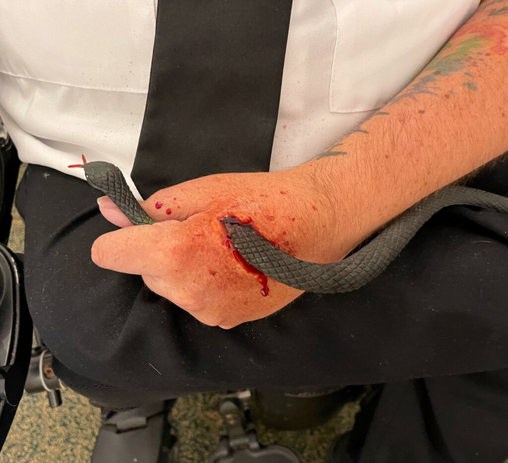 Magic Wheelchair also hired a makeup artist, the amazing Sy Bedrick, to do mine and my mom’s makeup for the event. Sy created some epic looks and had snakes coming out of my arms, ears, and face. It was wild and by the time they had my makeup and costume finished, I was just in awe of how awesome it was. My “Snakes on a Plane” idea turned out to be more than I could’ve ever dreamed of thanks to Magic Wheelchair. They are a nonprofit and are on a mission to create amazing costumes for wheelchair users, so definitely check them out here and consider donating if you have the means.