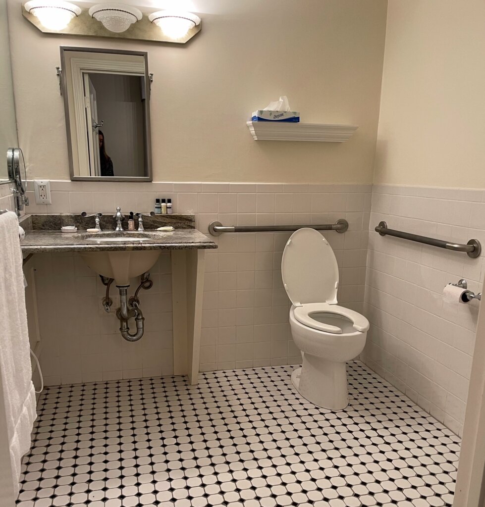 My wheelchair accessible room was quite spacious and had a desk, a TV, and one bed. Unfortunately, a hoyer lift could not roll under the bed since it was on a block frame, but the room worked for my needs.