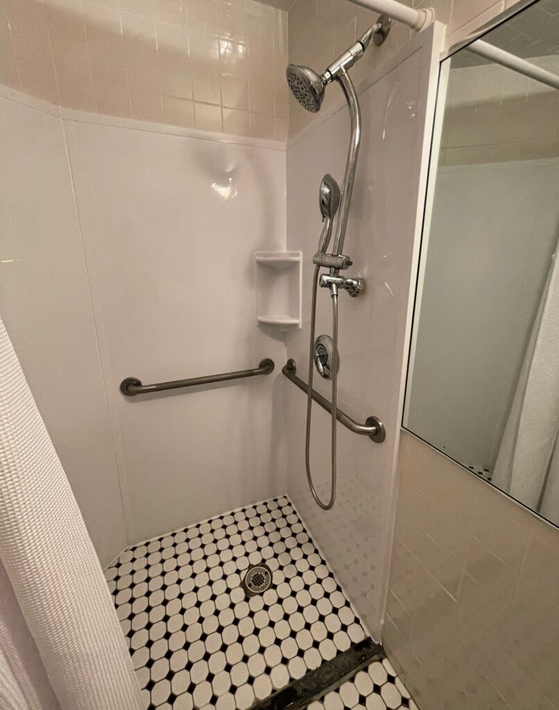In my bathroom, there was a pull-under sink, grab bars by the toilet, and a great roll-in shower. The roll-in shower had smooth entry and there was a handheld shower wand. The bathroom really could not have been any better for my accessibility needs.