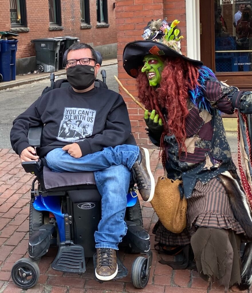 Before traveling to Salem, I was told to be prepared for brutal cobblestone, but 99% of where I rolled in Salem had smooth brick tile and wasn’t really bumpy at all. I was pleasantly surprised at how smooth the streets and sidewalks were for the most part. In October when I visited, there were many interesting characters on Essex Street as well and I enjoyed getting photos with them.