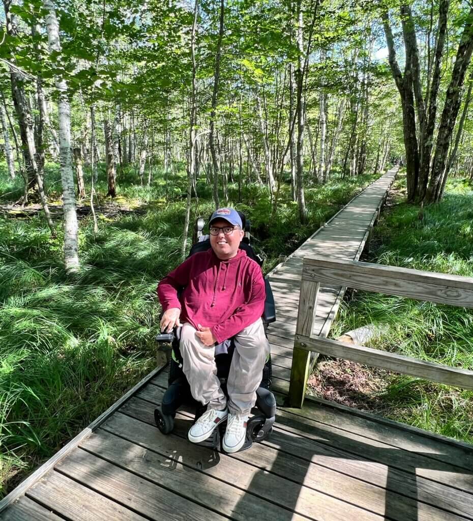 The total of the two connected trails (Jesus Path and Hemlock Loop) is around 1.5 miles round trip and they are both wheelchair accessible. Along the paths, you’ll find an accessible raised, wooded boardwalk that takes you through the woods and over the marsh, which is quite a unique experience. At the end of the boardwalk section, the trail continues with small packed gravel and I had no trouble at all rolling on it.