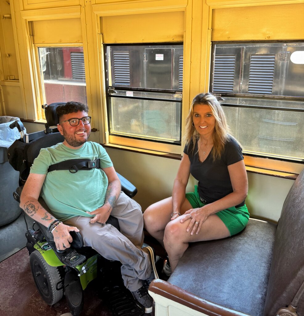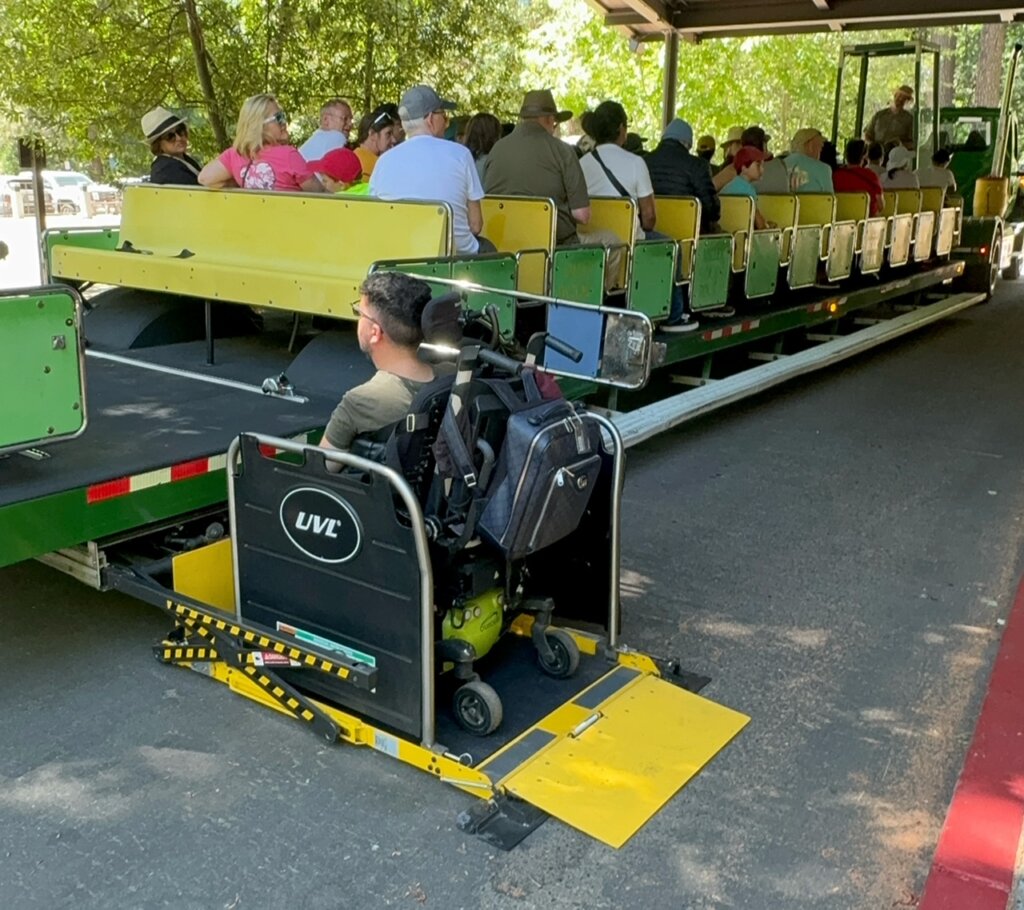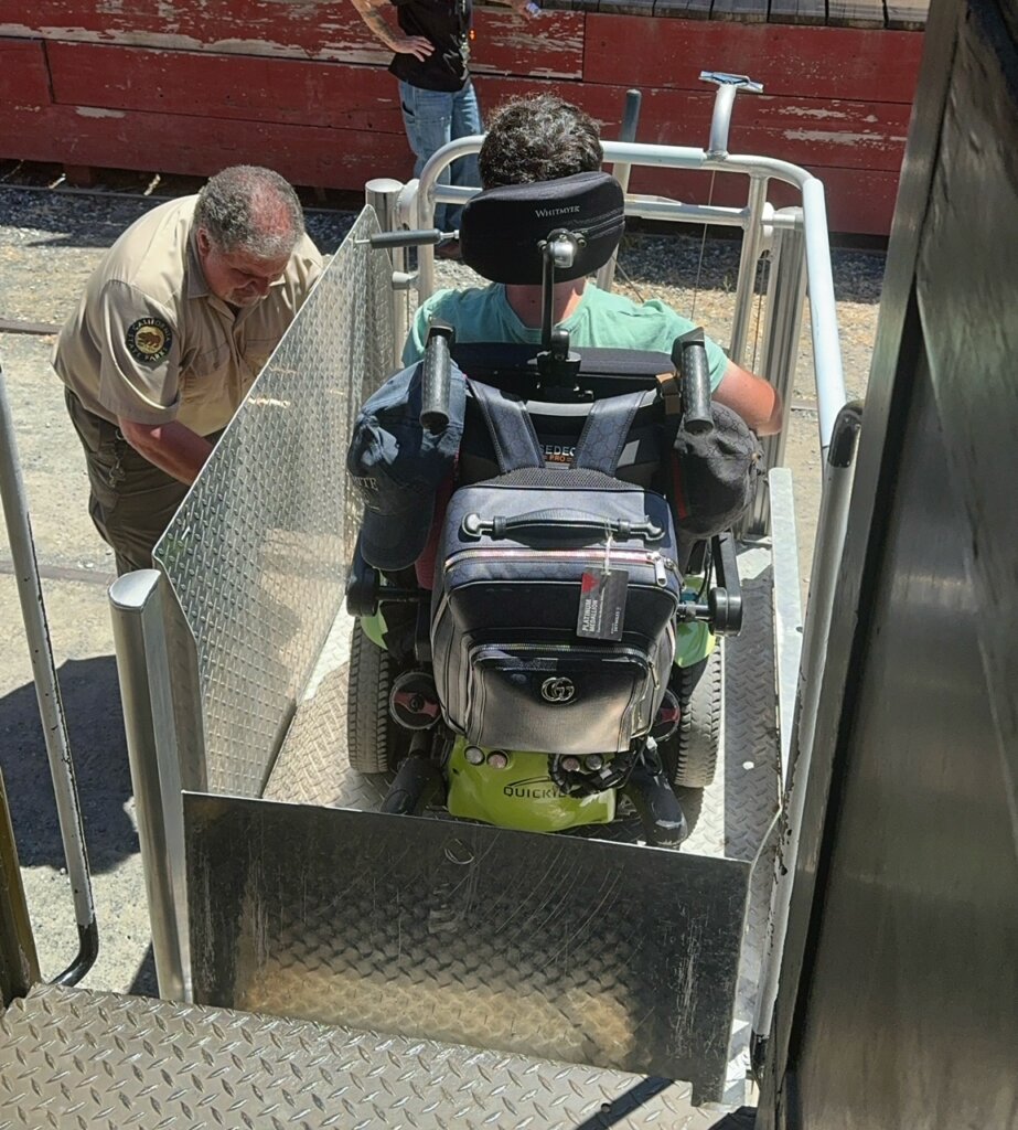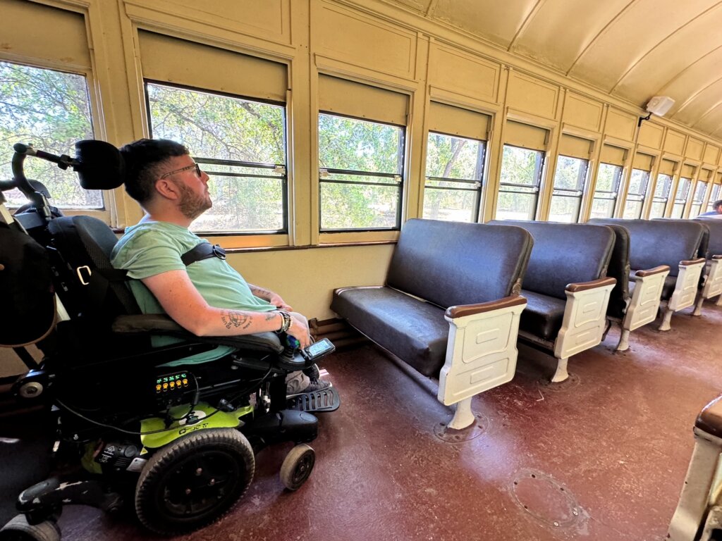 The train is accessible for most wheelchairs. A lift was available to get me onboard, but the trickiest part happened once I got on the train. To get to the wheelchair accessible seating area, I had to roll through a narrow door. My powered wheelchair fit through it perfectly, but if my chair would’ve been an inch wider, there’s no way it would fit. My wheelchair is 24 inches wide, so as long as the width of your wheelchair is 24 inches or less, you should be good.