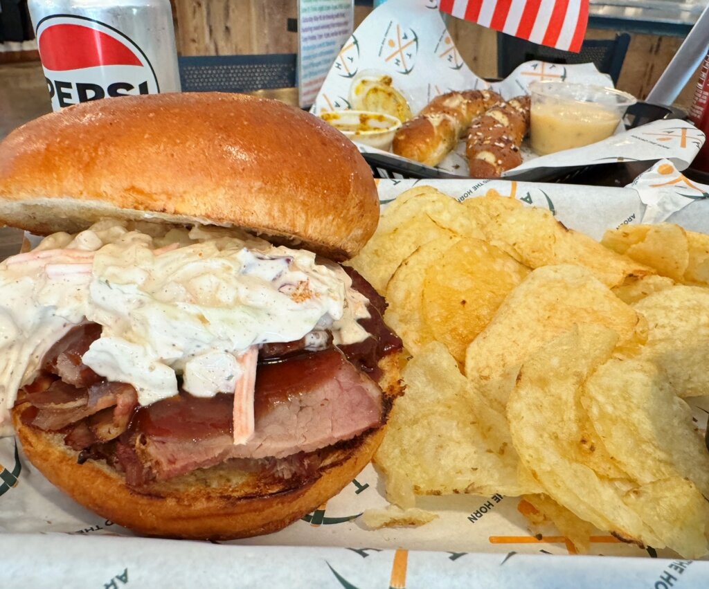 In Groveland, I also visited and had lunch at Around the Horn Brewing Company. This brewery had a variety of draft beers with creative names like “Gold Mines & Tan Lines” and “Hetch Hetchy Haze”, just to name a couple. Around the Horn had some delicious food as well and I really loved the pretzels with beer cheese for an appetizer and the brisket sandwich for my entree. The brewery is easily wheelchair accessible and has an accessible companion-care restroom.