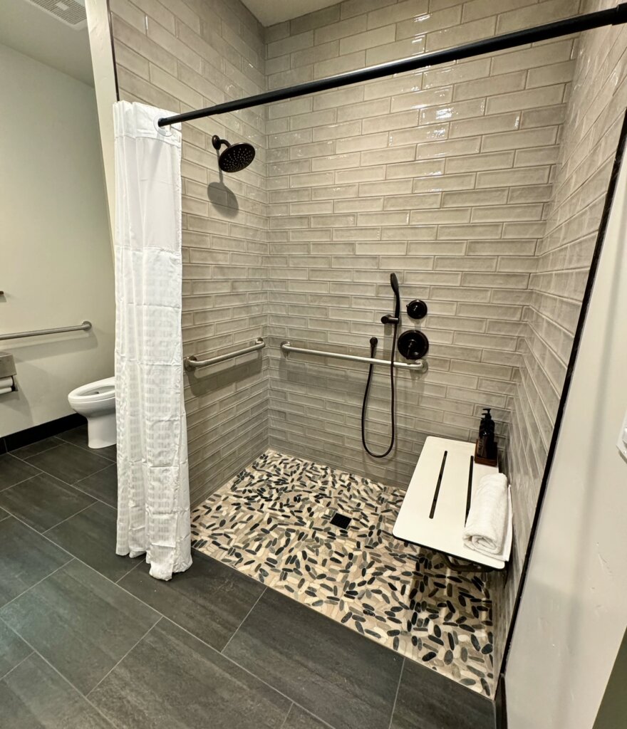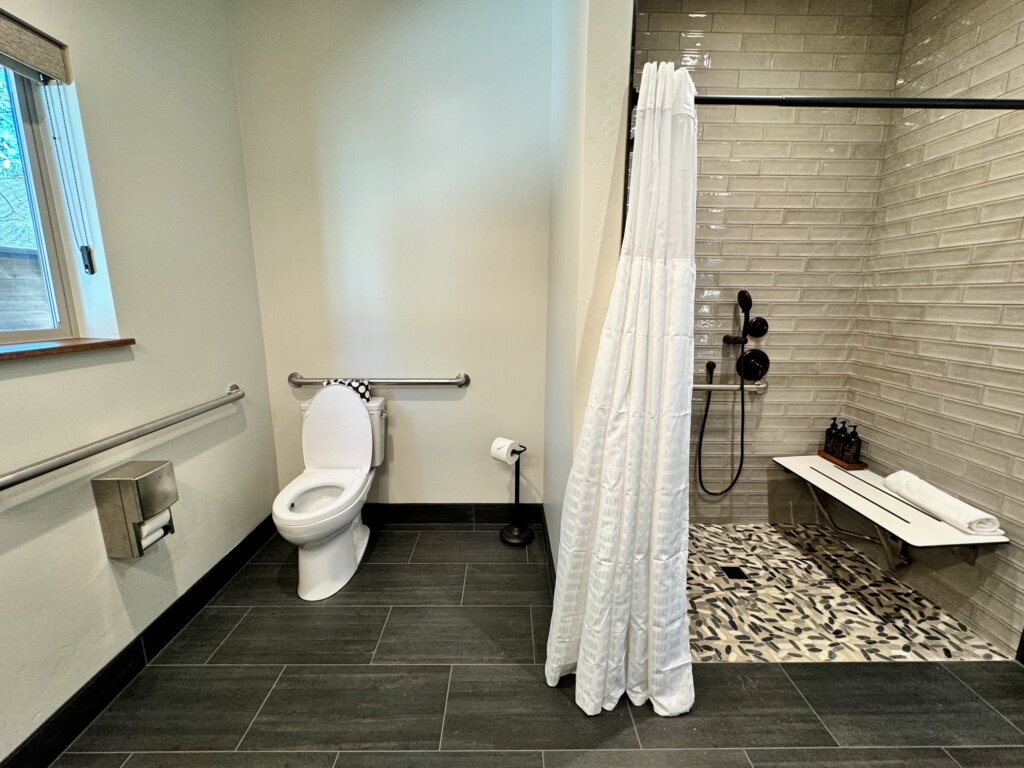 In one of the bathrooms (the one by the most accessible bedroom), there was a roll-in shower with smooth entry, a pull-under sink, and grab bars. The bathroom really couldn’t have been more perfect for my accessibility needs.