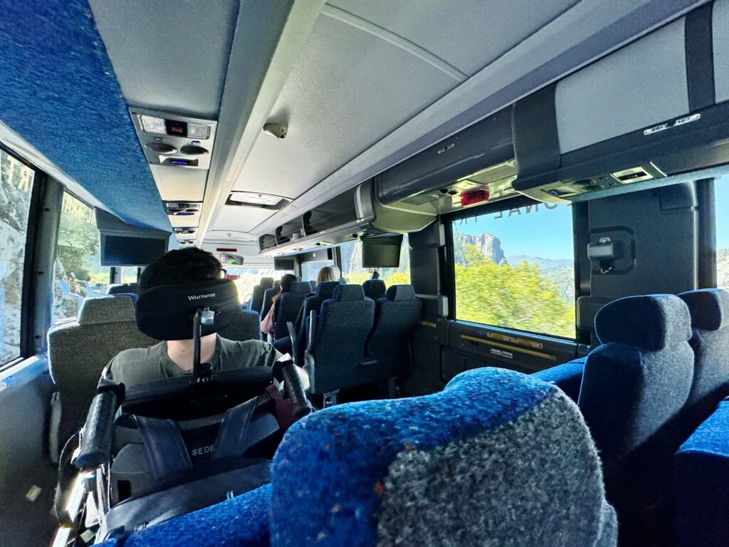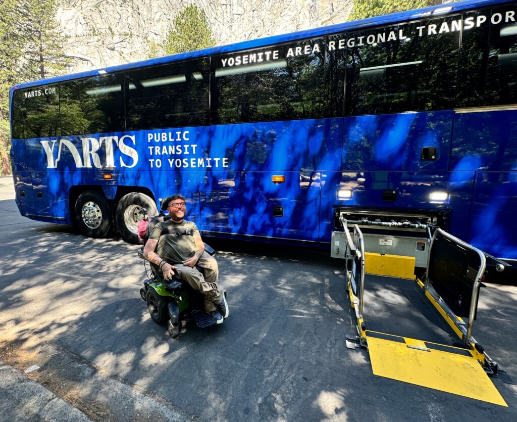 Yosemite gets extremely busy during peak season (summer), so finding accessible parking spots can be tricky. That’s why I opted to use alternative transportation options for getting in and out of the park. On the morning of our visit, my mom and I drove our accessible rental van to Rush Creek Lodge, which is very close to the park’s entrance. At Rush Creek Lodge, there is a YARTS bus station. What does YARTS stand for, you ask? It’s the Yosemite Area Regional Transportation System and it can take you into the park.