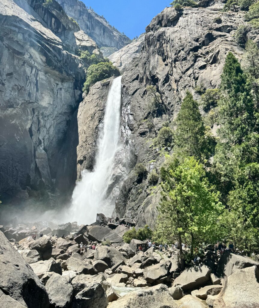 Now that we had eaten lunch and found some souvenirs, we were refueled and ready to explore more of Yosemite. Luckily, Yosemite has some wheelchair accessible trails and one of the most accessible trails is just a short 5-minute walk/roll from Yosemite Valley Lodge. This accessible trail is the Lower Yosemite Falls Trail. From this wheelchair accessible trail, you can see Yosemite Falls, which is the tallest waterfall in North America.