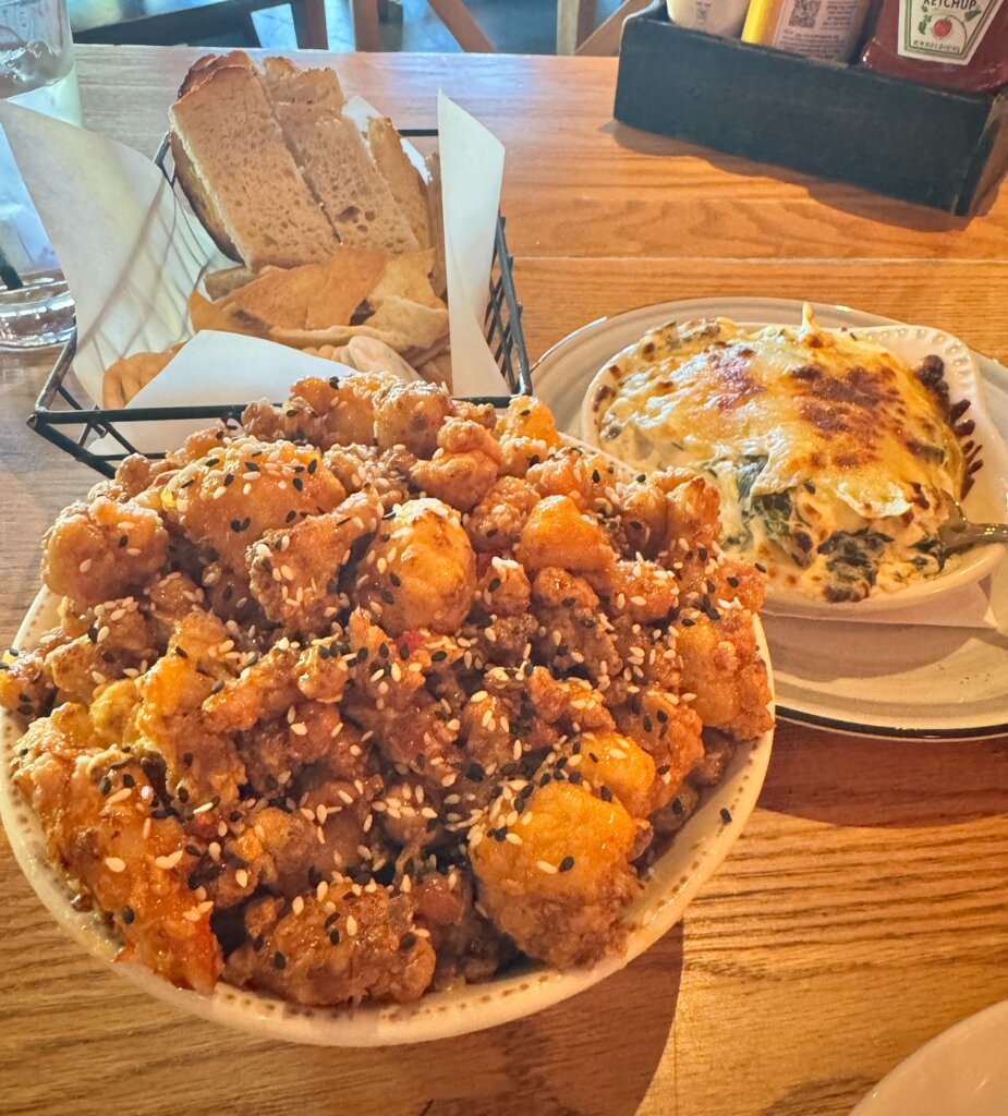 For an appetizer, we had spinach artichoke dip and crispy fried cauliflower. Both were delicious, but the cauliflower was by far the best fried cauliflower I’ve ever eaten… and the portion was huge! For my entree, I had the BBQ chicken flatbread and ended up eating the entire thing. It was so good, I just couldn’t stop eating it.