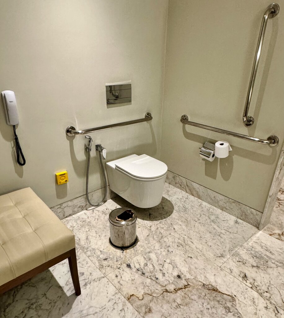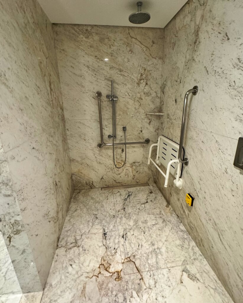 In the bathroom, there were 2 pull-under sinks, grab bars by the toilet, and the largest roll-in shower I’d ever seen. The shower had smooth entry, a fold-down seat, a handheld shower wand, and grab bars. To be honest, this was the most accessible bathroom I’ve seen in a looooong time and I fell head over heels in love with it.