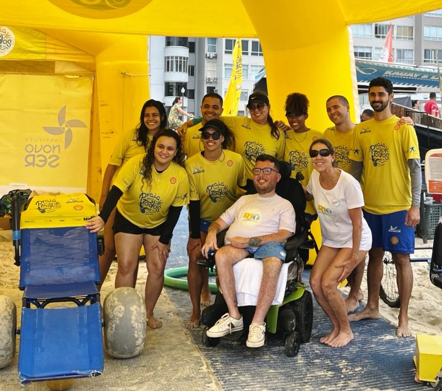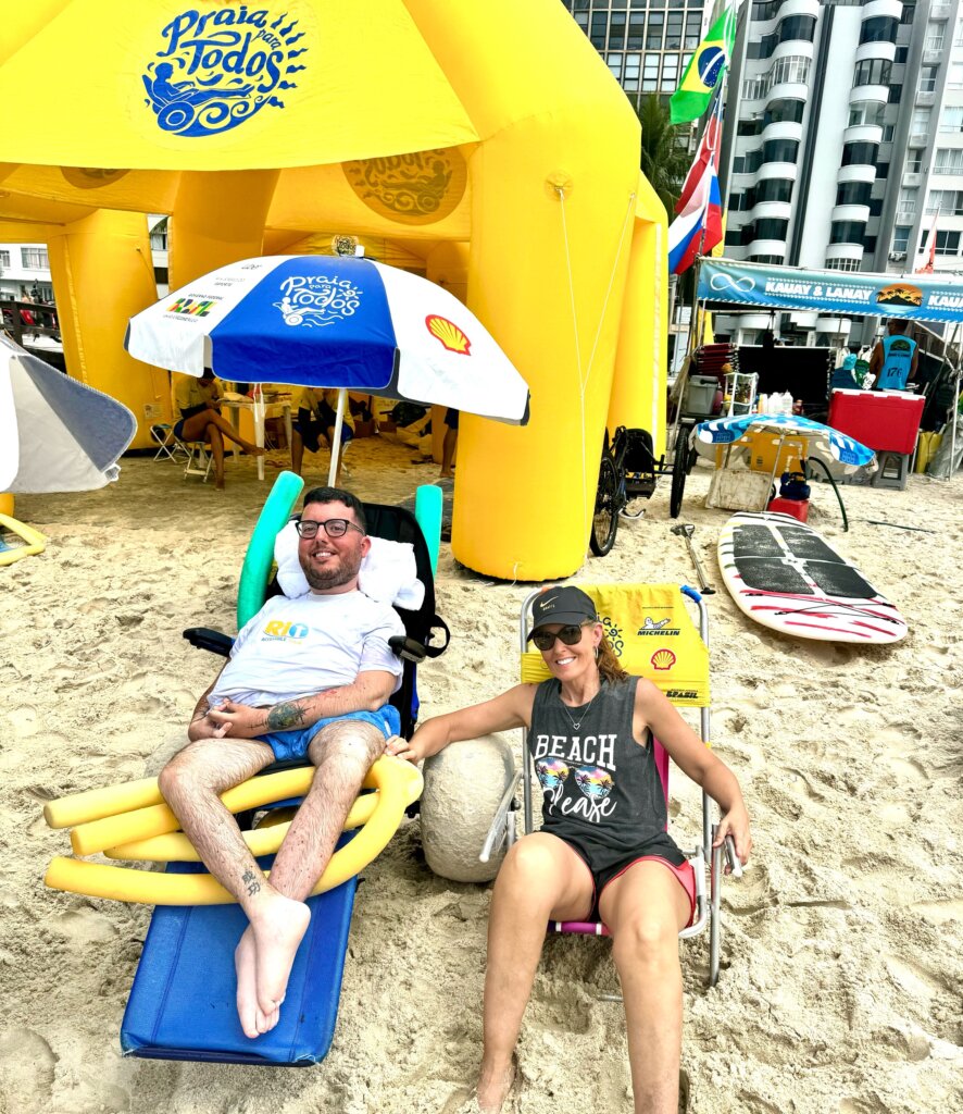 Upon arriving to the Praia para Todos tent on Copacabana Beach, their team helped transfer me from my powered wheelchair to an amphibious beach wheelchair. Once I was sitting in the beach wheelchair, they helped me get comfortable with pool noodles and other items to keep me stable in the chair. They were really innovative and did a remarkable job of making me comfortable and safe.