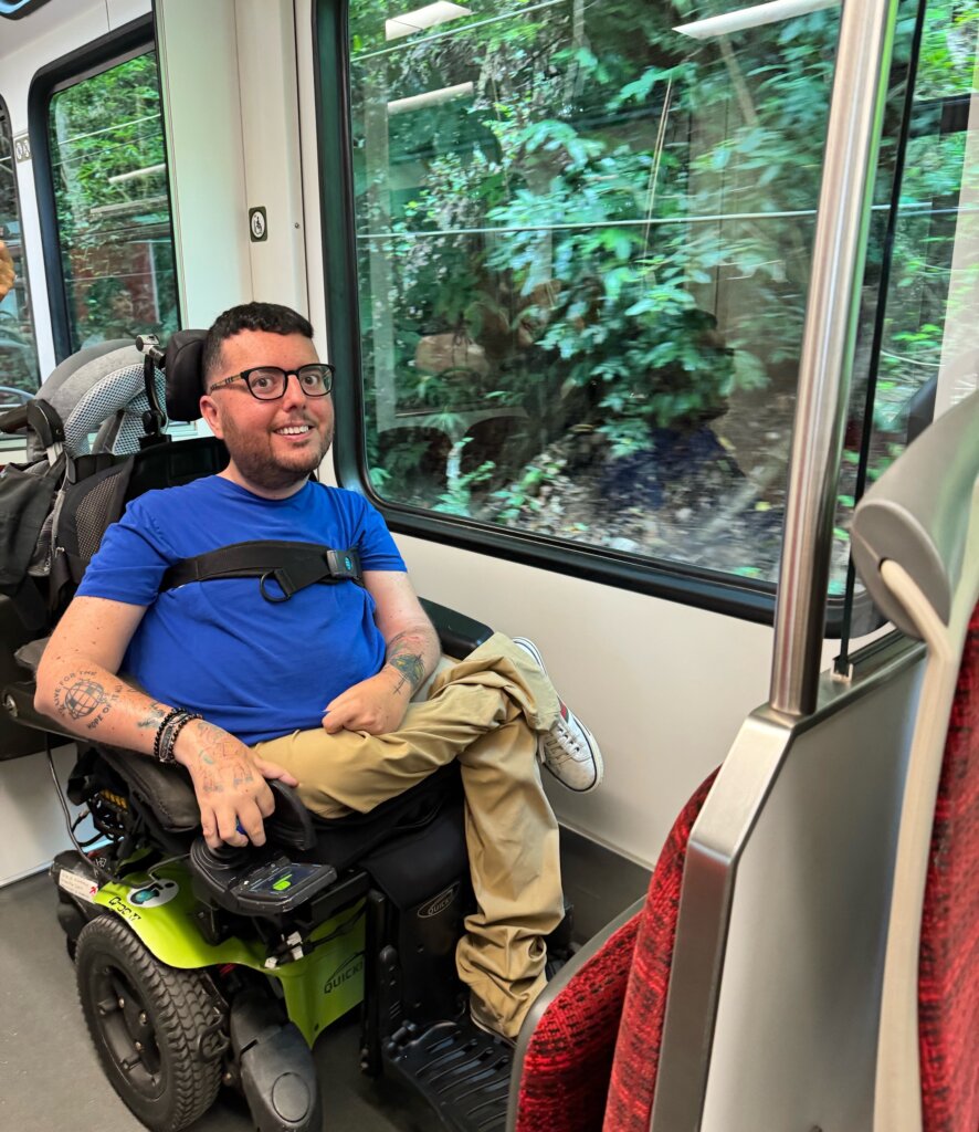 Luckily, a manual wheelchair was available to use, so I transferred from my powered wheelchair to the manual wheelchair that they provided. My mom and Kayla transferred me with my ableSling Lite and it worked like a charm. Once I was in the manual wheelchair, a couple staff members got me on the escalator and up we went. It was certainly a bit nerve-wracking, but it went much smoother than I expected. The manual wheelchair handled the two escalators with ease, thankfully.