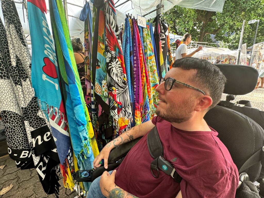 The pathways here between the street vendors were easy for my powered wheelchair to maneuver. I had no issues at all visiting the booths and seeing all the stuff that had been made in Brazil. I saw some of the most gorgeous Brazilian paintings showcasing landmarks around the city, rope woven parrots and animals, which my mom could not resist, and handcrafted jewelry, t-shirts, trinkets, and so much more. The atmosphere was very chill and relaxed, and I really enjoyed talking with the local vendors, as they were all genuinely friendly and nice.