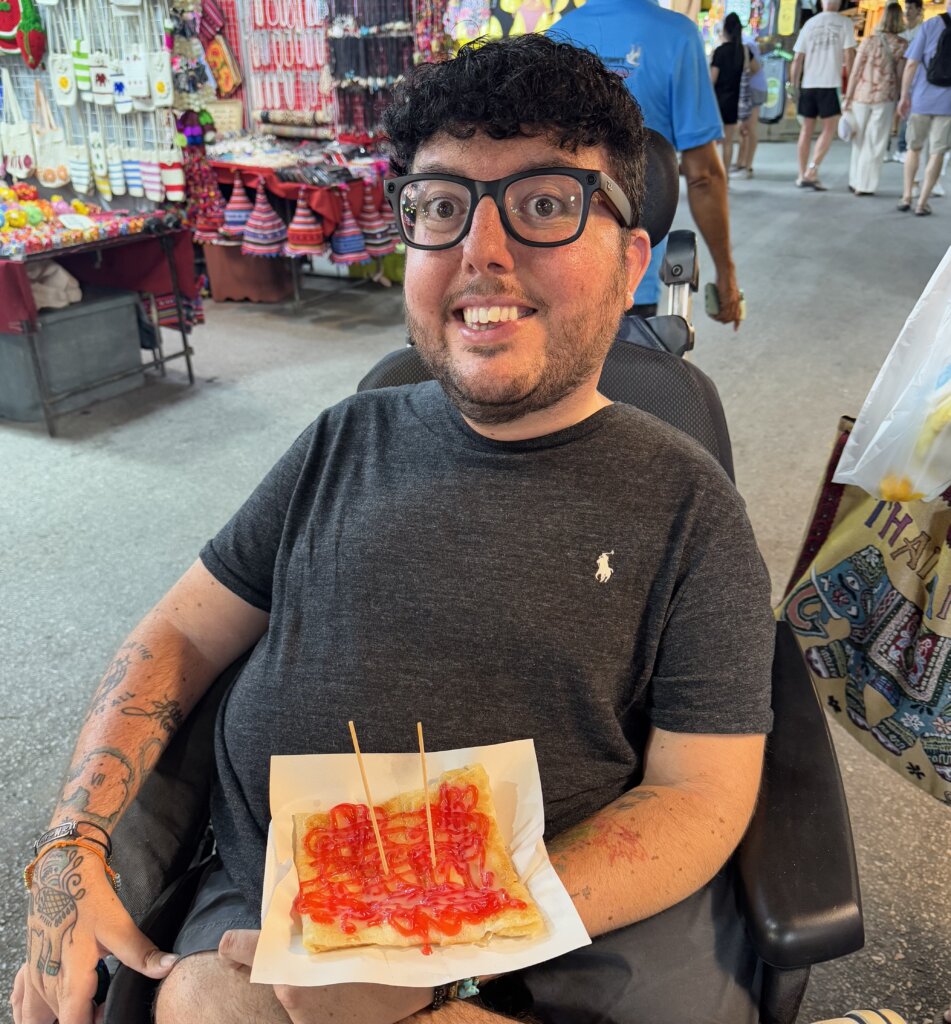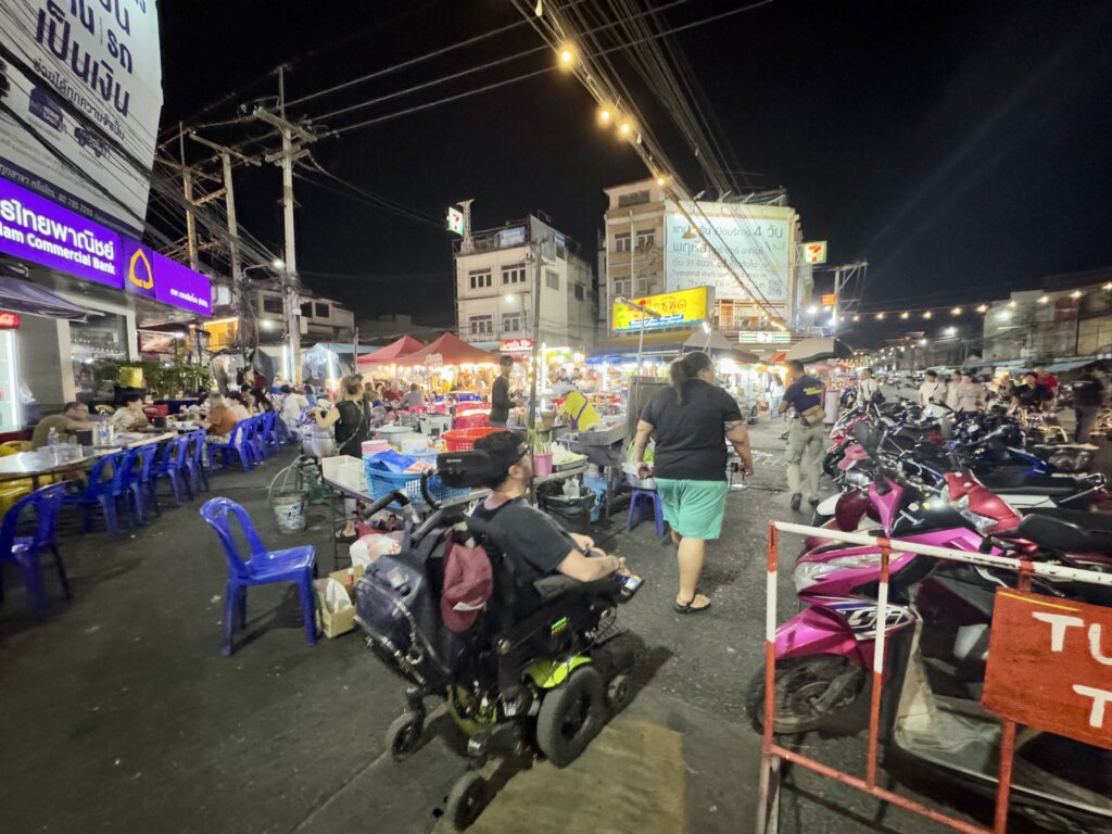 The Hua Hin Night Market was a whirlwind of sights, sounds, and smells, and navigating it in my wheelchair was easily manageable. The market was bustling, but the main walkways were wide enough to maneuver through the crowds, even with the constant flow of people. Overall, I was able to roll along smoothly and soak in the vibrant atmosphere. The energy was infectious, with hundreds of vendors and aroma of street food filling the air.