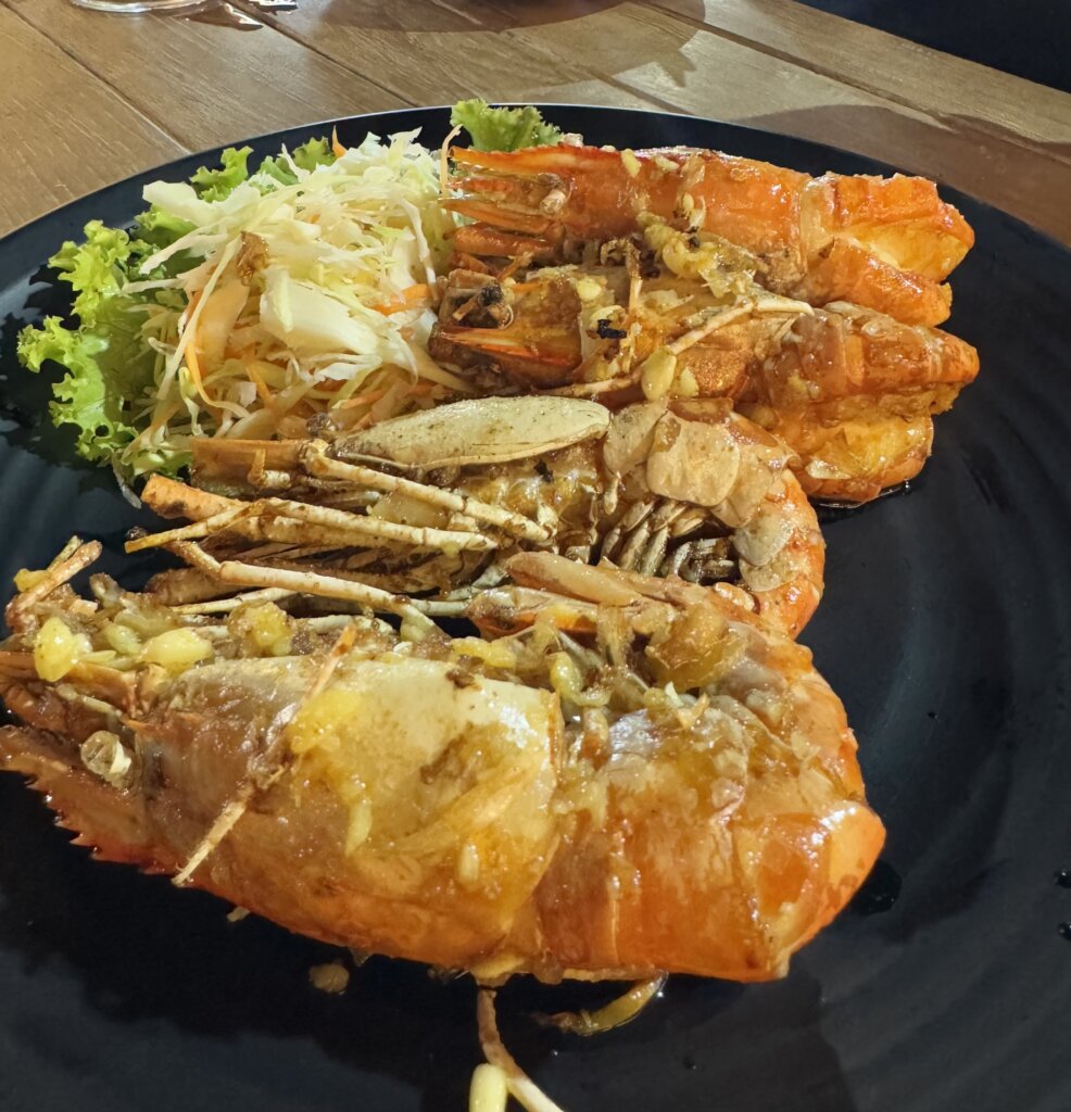 To cap off our evening, we had a fantastic dinner at KO Seafood, located in the Hua Hin Night Market. The garlic butter prawns were absolutely divine, cooked to perfection and bursting with flavor. We sat outside, which was amazing because a live band was playing and we were able to observe the crowds at the night market. It was the perfect ending to a lively and delicious night.