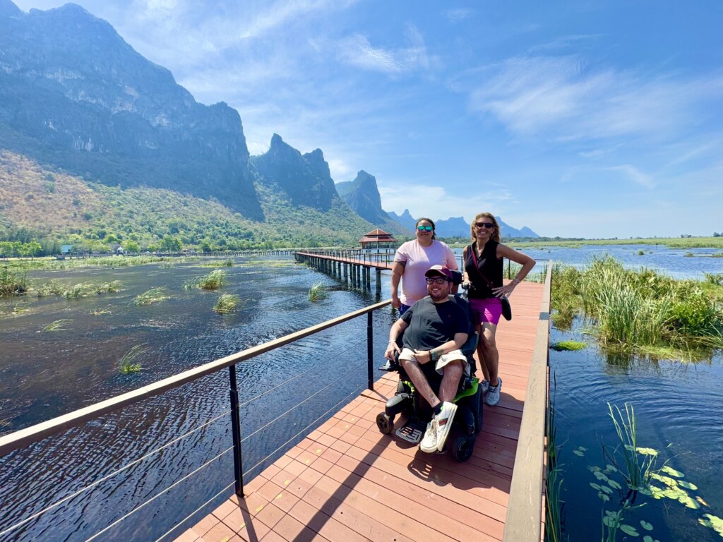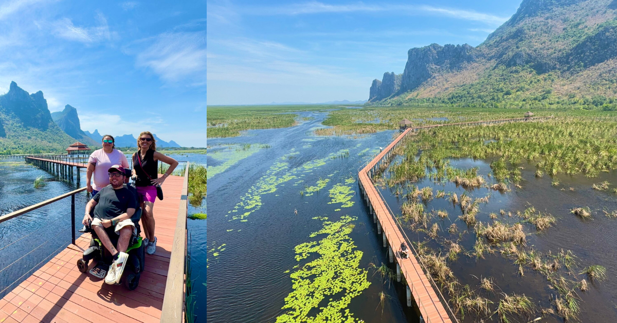 The Bueng Bua Boardwalk in Khao Sam Roi Yot National Park is only about 40 minutes from Hua Hin. It was easy to reach and once there, I was immediately impressed by the scenery. There were grand mountains all around us and it was smooth for me to roll onto the boardwalk path in my powered wheelchair.
