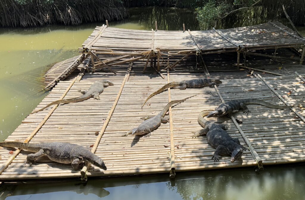 The paths wound their way through the mangroves for over a kilometer, offering immersive views of the unique environment. The intricate root systems of the mangrove trees were fascinating to observe, and we even spotted a variety of birds and some water monitor lizards at one point. For a minimal fee, food was available to purchase to throw to the lizards.