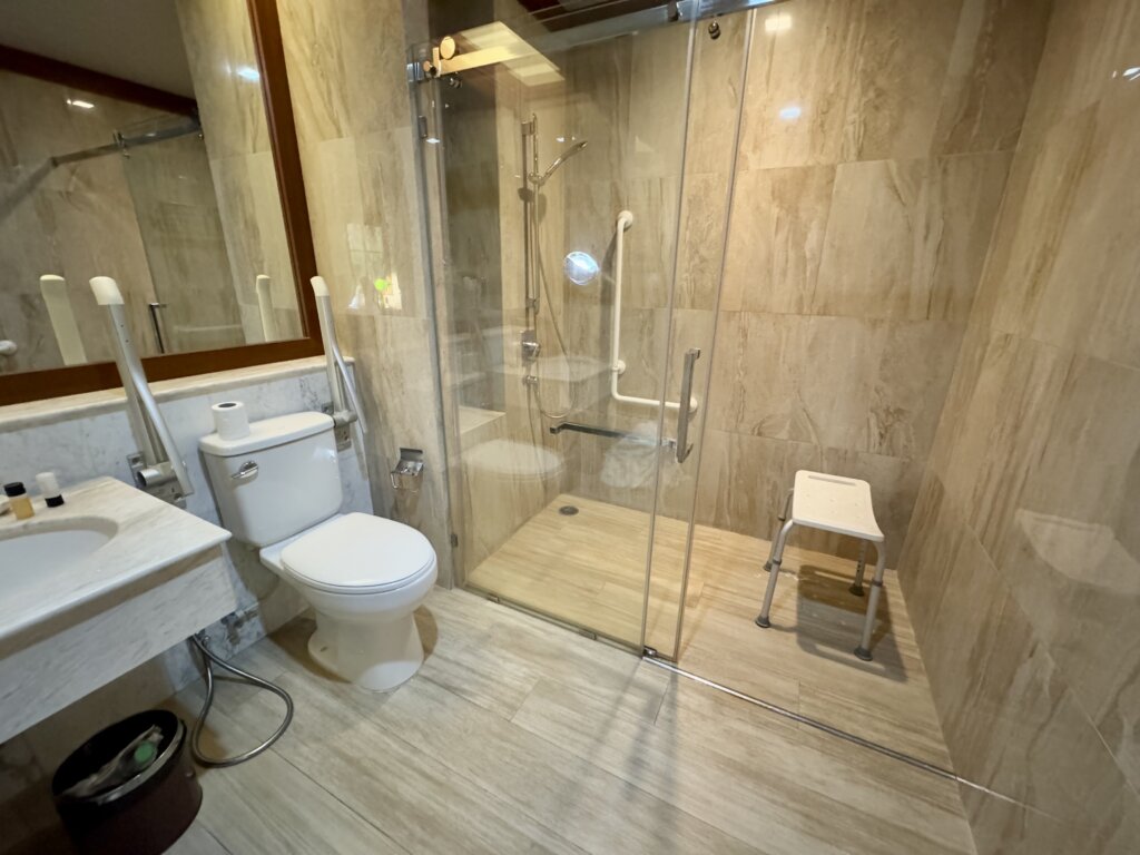 Our wheelchair accessible room was on the ground floor. It was spacious and had two single beds, plus one rollaway bed. The main beds were 25 inches tall and had clearance underneath for a hoyer lift.